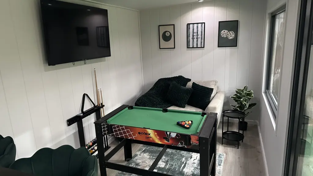 Install chillers, bar and furniture along with entertainment such as a TV, speakers, a dart board, or even a pool table if space allows. These additions help transform your garden bar into a lively social hub with all the comforts you need for parties, gatherings, or relaxed evenings.