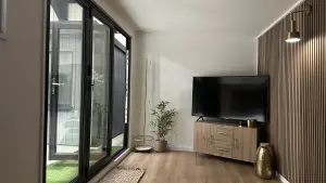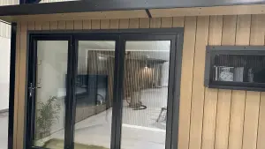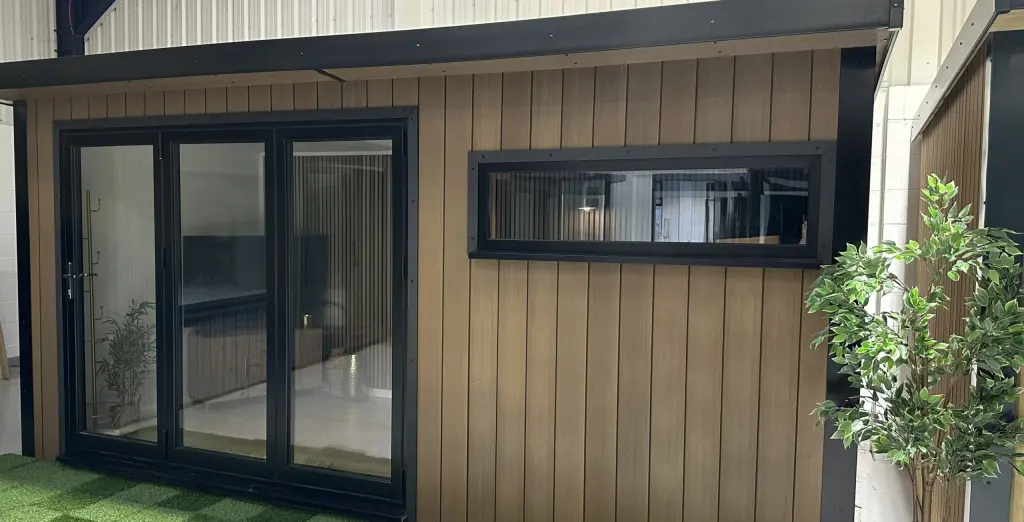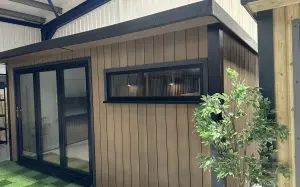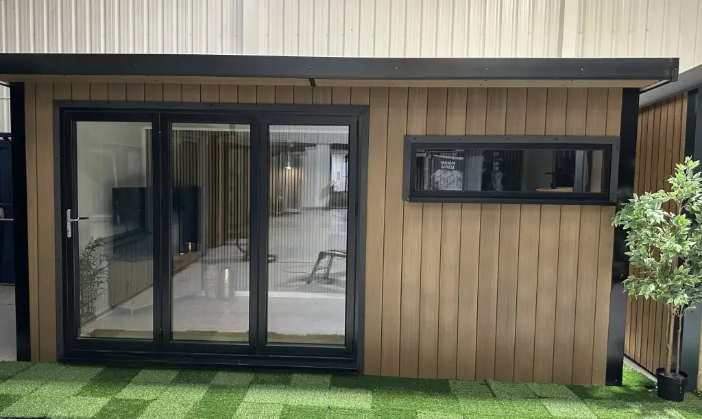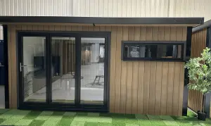 A smart pent roof, full insulation to roof, walls and floor, 8 ft anthracite-grey aluminium bifold doors, matching window and a tough EPDM rubber roof create a light-filled retreat built to last. Delivered and professionally fitted free within 150 miles of our show site, it’s a hassle-free upgrade for work, relaxation or entertaining.