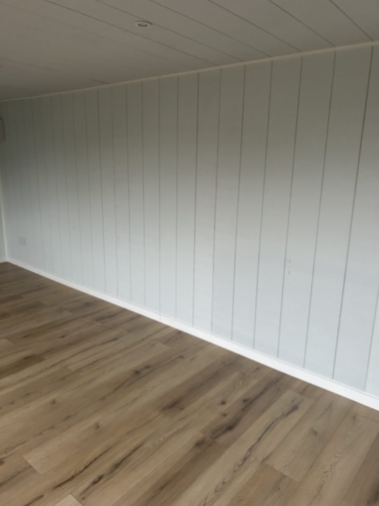 - Walls installed with Waterproof wall membrane, insulated with insulation roll and fully boarded with a choice of Smooth MDF Boards or 9mm bead and butt;