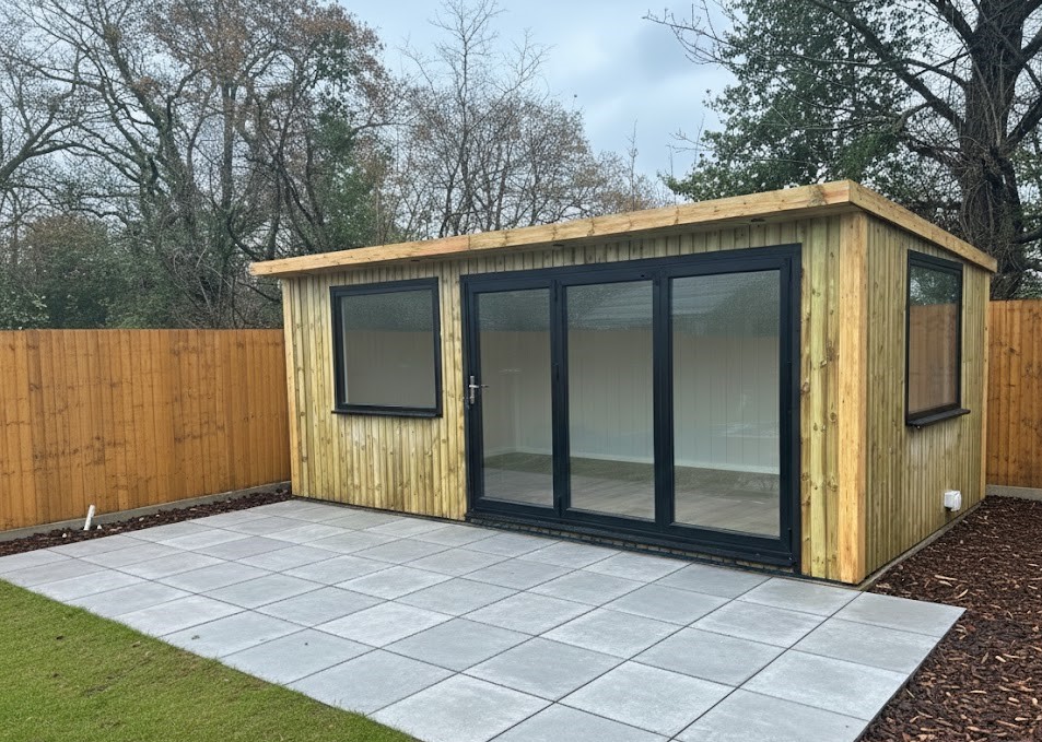 Fully insulated to roof, walls and floor, it features 8 ft anthracite-grey aluminium bifold doors, a generous matching window and a hard-wearing EPDM rubber roof for true year-round comfort. Delivered and professionally fitted free within 150 miles of our show site, it’s a ready-to-enjoy space for work, wellness or laid-back entertaining.